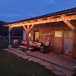 Gemütlicher, beheizbarer Raum für ca. 12 Personen, außen mit überdachter Terrasse, zum Einstimmen, als Ausklang oder zum Feiern.